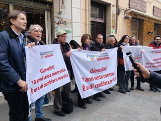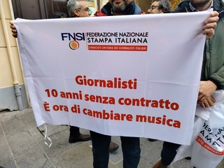 Flash mob dei giornalisti davanti al Teatro Ariston di Sanremo, dove la Fnsi (Federazione nazionale stampa italiana) ha portato in piazza la protesta per il rinnovo del contratto nazionale di lavoro, scaduto dal 1° aprile 2016. La manifestazione, organizzata in via Goffredo Mameli, ha riunito giornalisti dipendenti, autonomi e collaboratori per denunciare dieci anni di mancato rinnovo e il progressivo impoverimento della professione.