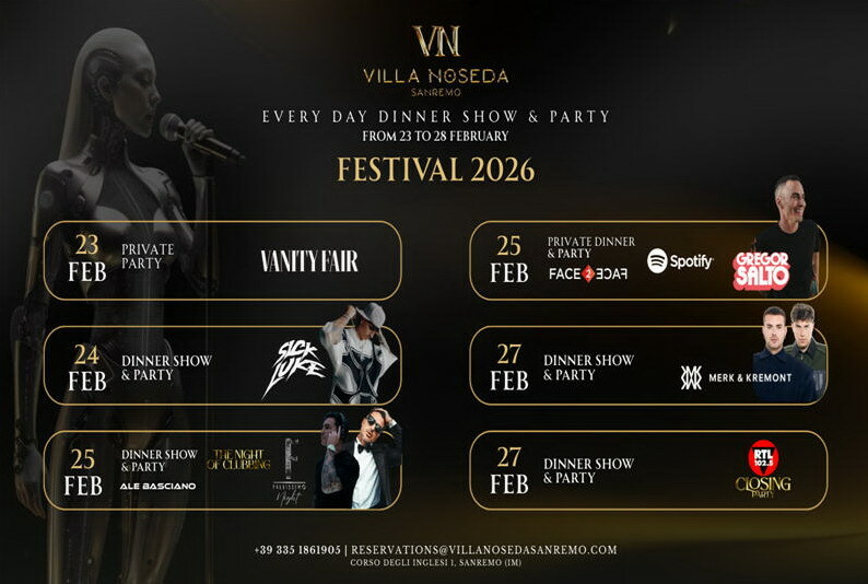 Un’ouverture perfetta per un calendario ricco di appuntamenti che, da martedì 24 a sabato 28 febbraio, vedrà alternarsi Dinner Show raffinati e party notturni dal respiro internazionale, capaci di prolungare l’energia sanremese fino alle prime ore del mattino. «Villa Noseda è il luogo dove la musica incontra l’eleganza», raccontano gli organizzatori, sottolineando il carattere esclusivo dell’esperienza. Per tutta la durata della kermesse, ogni sera a partire dalle 20:30 andrà in scena un Dinner Show con performance live e momenti di spettacolo, seguito dal party dalle 00:30. Gli ospiti della cena avranno accesso esclusivo anche al dopocena, vivendo l’intera esperienza senza necessità di ulteriori prenotazioni.
