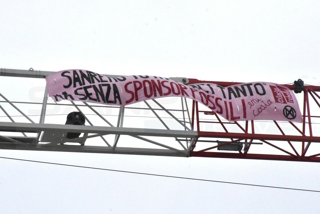 Non è bastato quanto accaduto ieri sera fuori dall’Ariston. Gli attivisti di Extinction Rebellion, hanno anche scalato la gru del cantiere in piazza Eroi Sanremesi, dove è stato issato uno striscione con su scritto “Il Festival ci piace tanto ma senza sponsor fossili’.