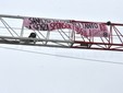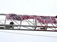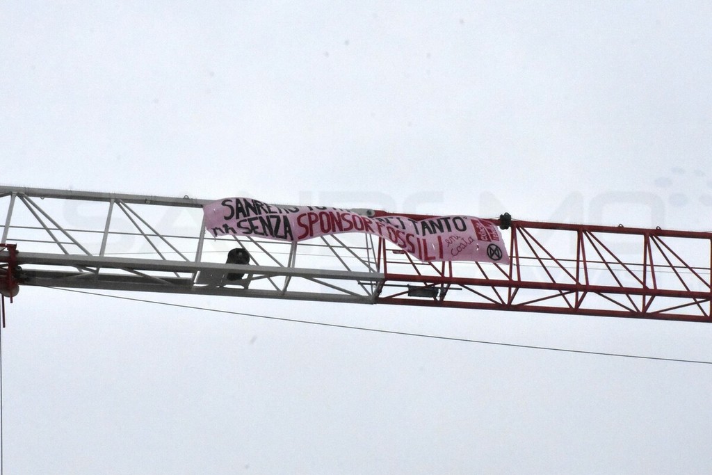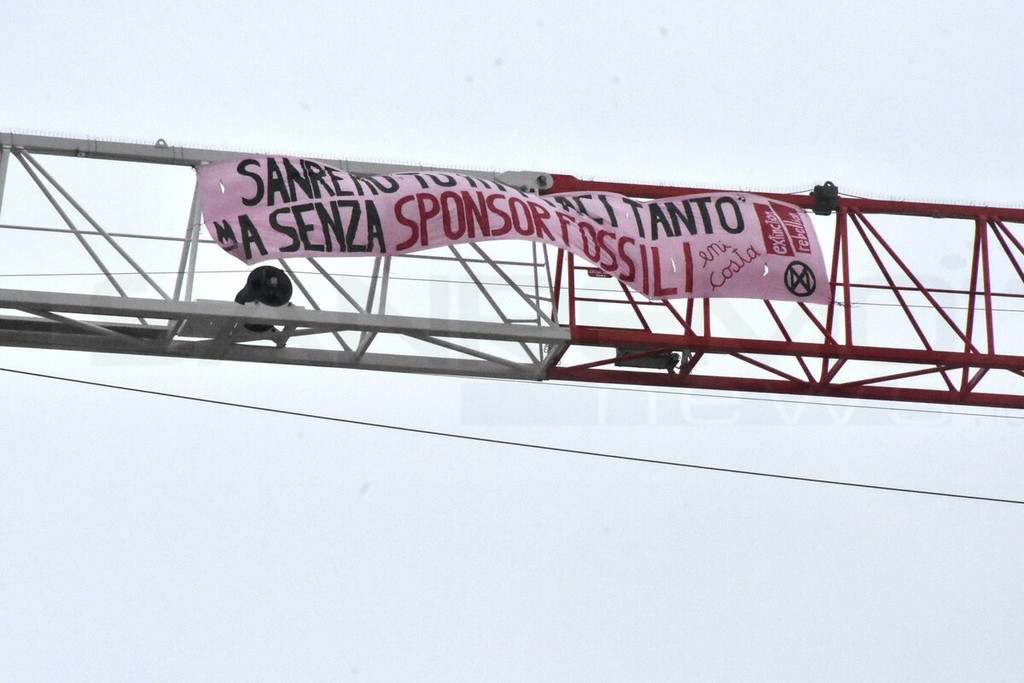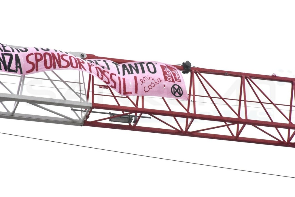 La nuova mossa è stata messa in piedi nella notte per denunciare le operazioni di greenwashing fatte dagli sponsor principali, ENI e Costa Crociere. Alcuni attivisti si sono pericolosamente arrampicati a mani nude sulla gru ed hanno appeso lo striscione.