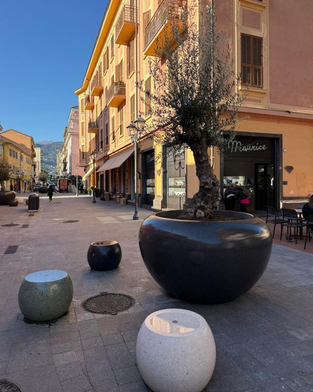 Nuovi alberi in via Aprosio a Ventimiglia. Sono stati posizionati degli ulivi all'interno degli enormi vasi, le nuove fioriere collocate, insieme alle sedute monoposto, lungo la via pedonale, come era stato precedentemente fatto in via Ruffini, per garantire armonia e uniformità nell’arredo urbano.