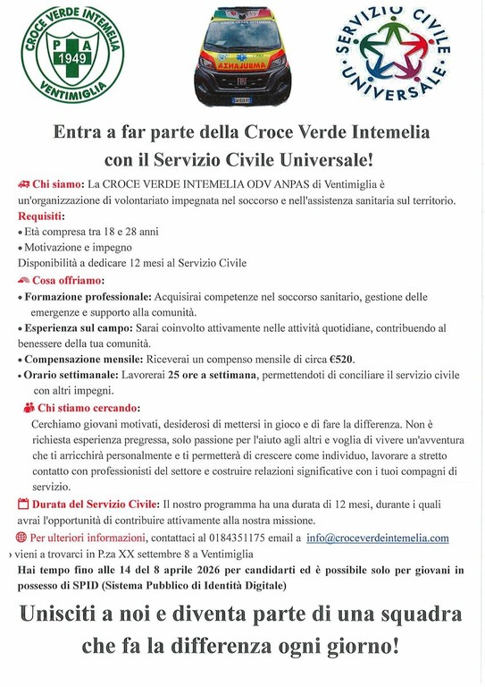 Proseguono presso la Croce Verde Intemelia di Ventimiglia le accettazioni delle domande per il Servizio Civile 2026, con scadenza fissata alle ore 14 dell’8 aprile. Sono cinque i posti disponibili per giovani motivati, desiderosi di mettersi in gioco e vivere un’esperienza formativa al servizio della comunità.