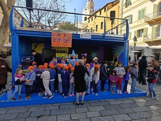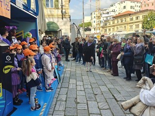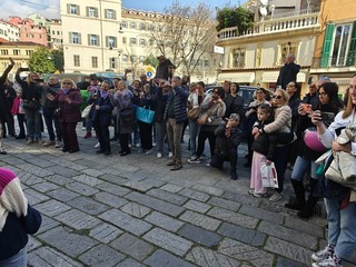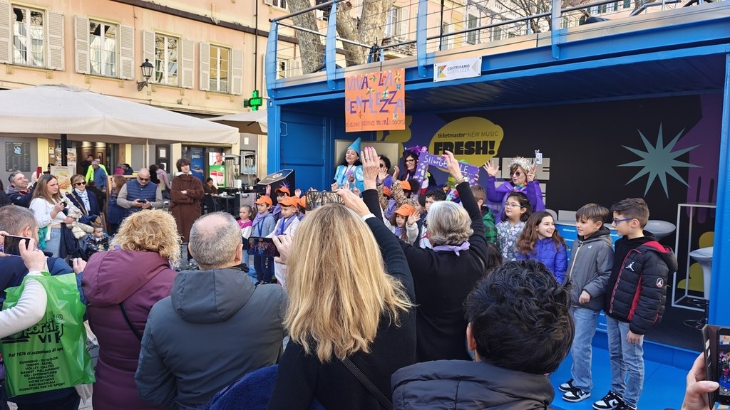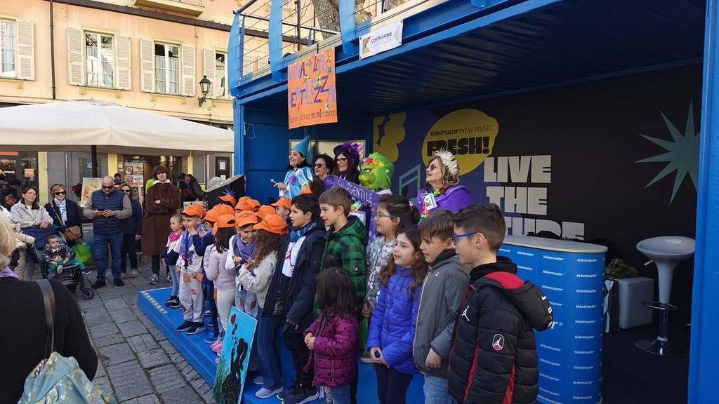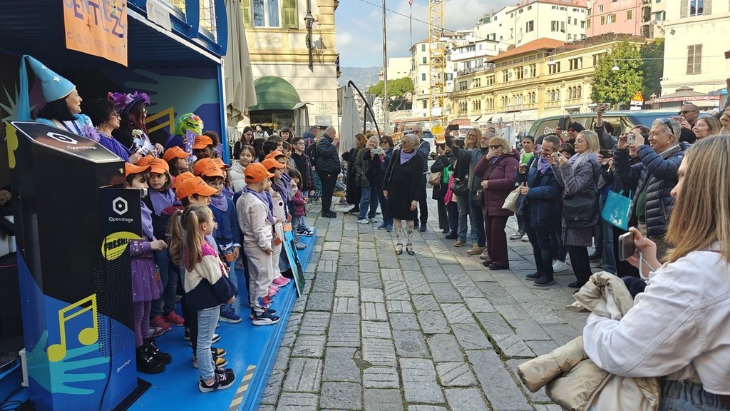 In piazza Eroi, approfittando del piccolo palco montato a fianco della statua di Siro Carli, hanno cantato la ‘Canzone della gentilezza’, un inno vero e proprio fatto di ‘grazie’, ‘prego’ e ‘per favore’, da lanciare a tutti.