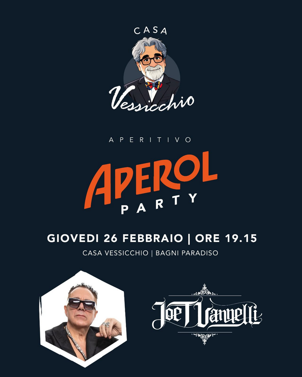 Questa sera Casa Vessicchio torna protagonista della nightlife sanremese con l’Aperol Party, l’aperitivo speciale in programma ai Bagni Paradiso sul Lungomare Vittorio Emanuele II, 31. L’ospite d’eccezione è Joe T Vannelli, icona della scena house italiana e internazionale, atteso per un set che promette di trasformare l’aperitivo in una vera serata di musica e ritmo.