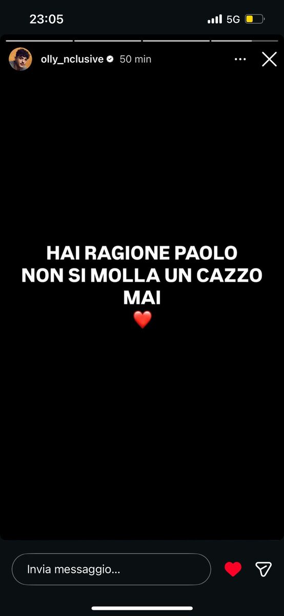 Pochi minuti dopo, con una storia Instagram, è arrivata la risposta di Olly: "Ha ragione Paolo. Non si molla un cazzo mai".
