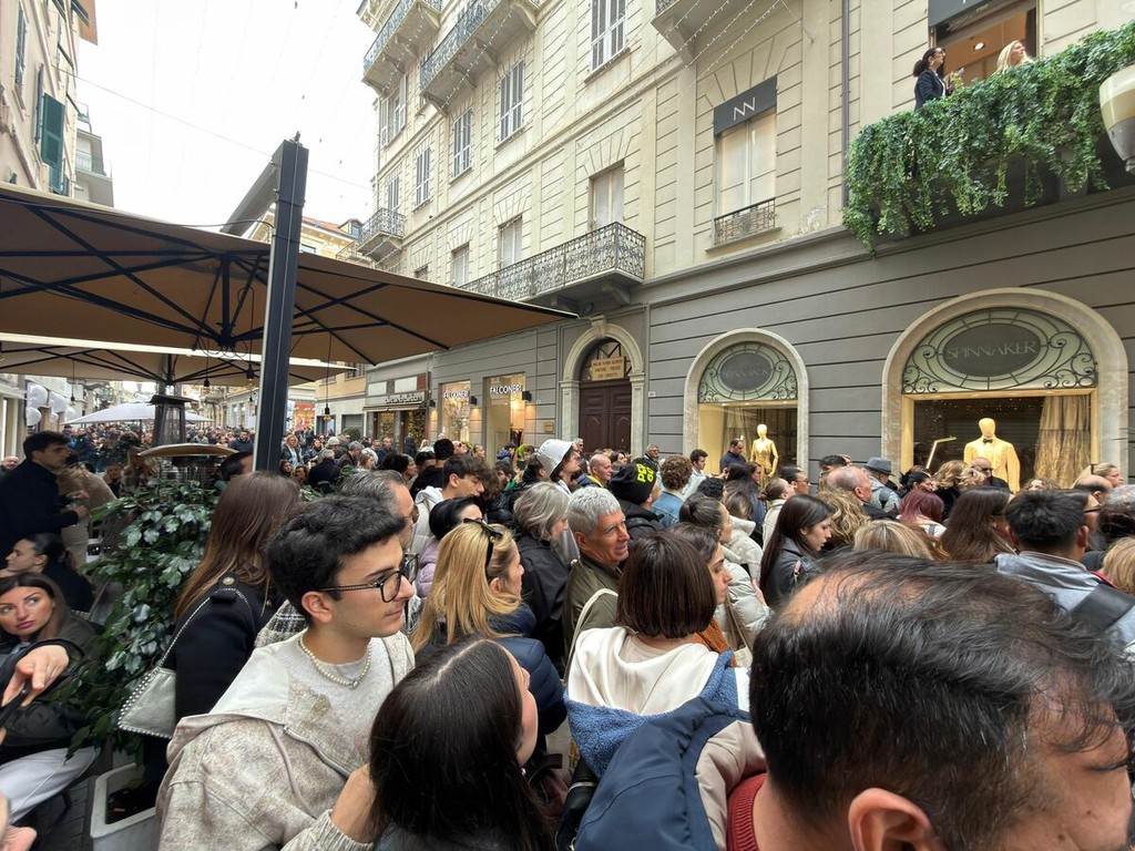 In pochi minuti la strada si è riempita completamente, con il flusso pedonale praticamente bloccato tra curiosi, fan e turisti. Un colpo d’occhio impressionante, che conferma come il Festival di Sanremo viva ormai anche fuori dal palco, tra balconi, dirette social e momenti improvvisati che diventano virali.