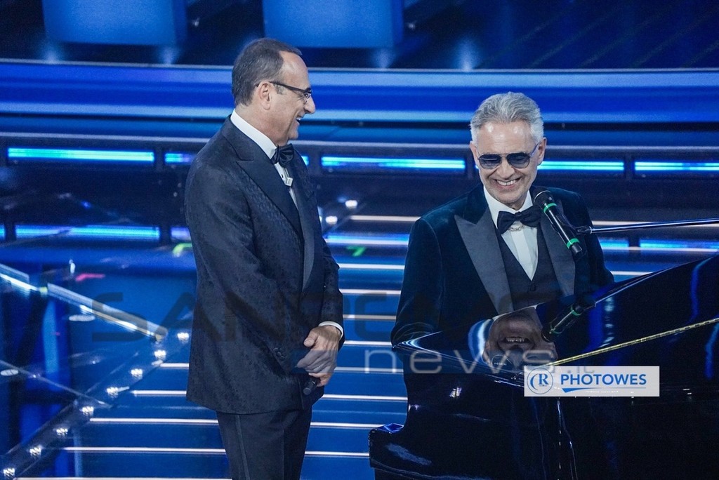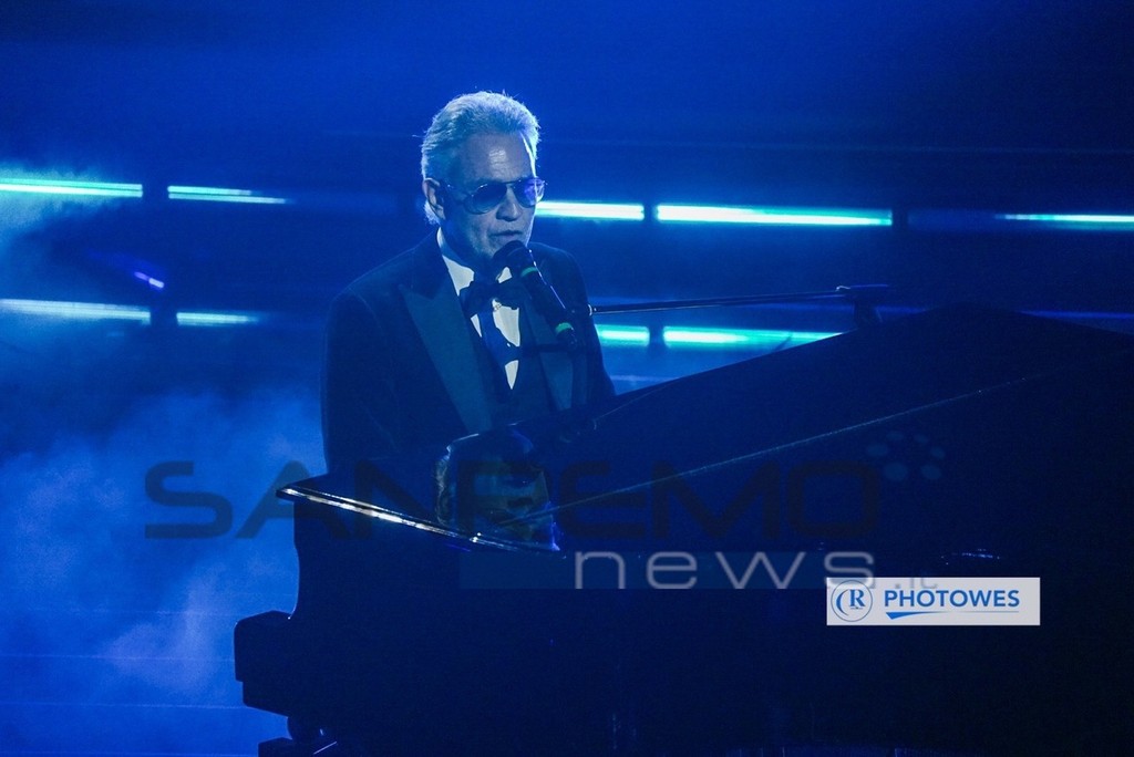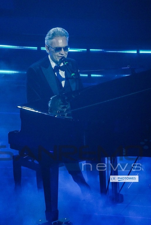 Andrea Bocelli ha incantato l'Ariston con la sua voce esibendosi con i brani “Il mare calmo della sera” e “Con te partirò”.