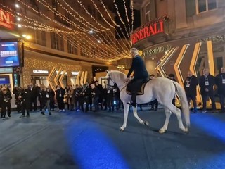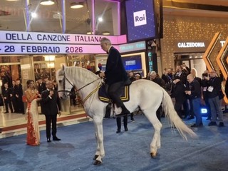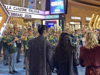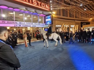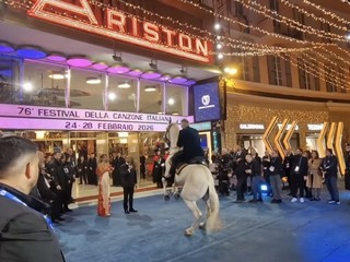 Si tratta dell’esibizione della banda della Guardia di Finanza in occasione della trasmissione ‘Prima Festival’ e dell’arrivo di Andrea Bocelli, in sella al suo cavallo.