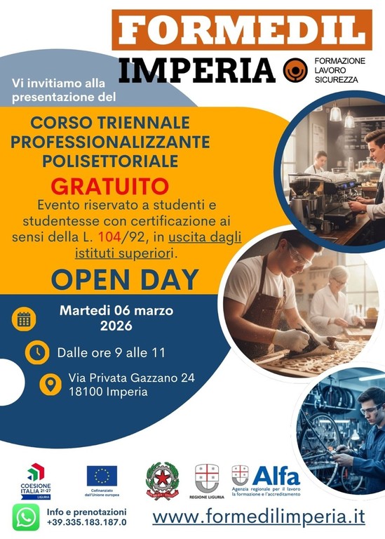 In questa prospettiva si inserisce anche l’Open Day del Corso Triennale Professionalizzante Polisettoriale gratuito, rivolto a studenti e studentesse con certificazione ai sensi della L. 104/92 in uscita dagli istituti superiori, in programma martedì 6 marzo 2026 presso la sede di Imperia. L’evento sarà dedicato alla presentazione dei percorsi di attività specializzata e delle opportunità formative offerte da Formedil Imperia.