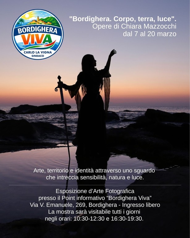 L'inaugurazione della mostra, a ingresso libero, sarà sabato 7 marzo alle 11. "Nel clima di riflessione e valorizzazione che accompagna la Giornata Internazionale della Donna, la lista civica indipendente 'Bordighera Viva - candidato sindaco Carlo La Vigna', ospiterà le opere dell'artista Chiara Mazzocchi, candidata della lista, nella sua mostra personale 'Bordighera. Corpo, terra, luce'" - fanno sapere gli organizzatori - "Un'occasione per celebrare la creatività e il profondo legame tra arte, territorio e identità, attraverso uno sguardo che intreccia sensibilità, natura e luce".