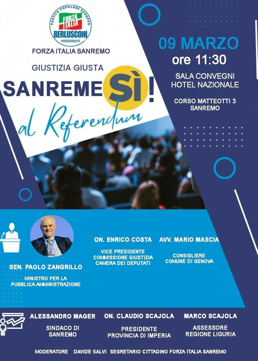 Si terrà lunedì prossimo alle 11.30 a Sanremo un incontro pubblico dedicato al referendum del 22 e 23 marzo, con particolare attenzione a chi sostiene le ragioni del “Sì”.