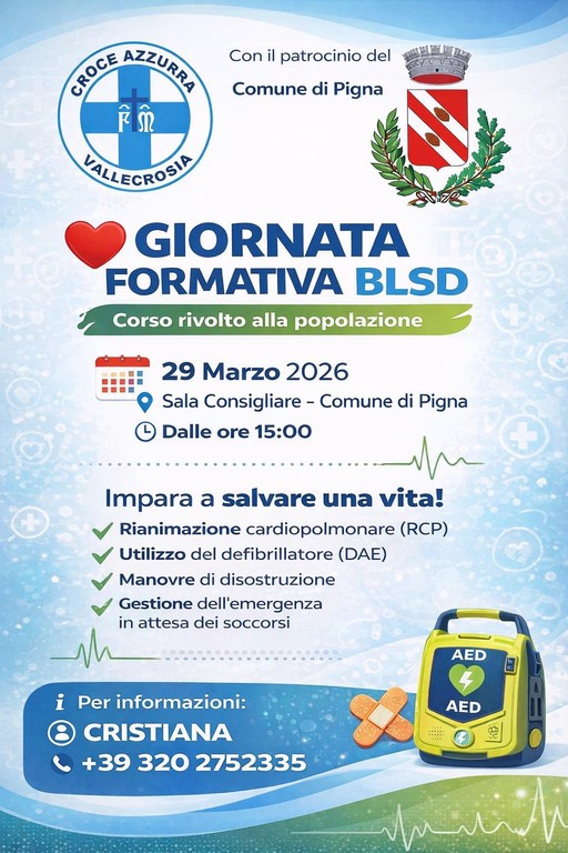Una 'Giornata formativa BLSD' verrà organizzata il 29 marzo dalle 15 nella sala consiliare del comune di Pigna.