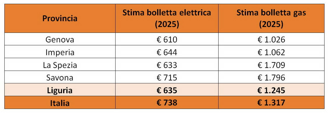 Ancora più evidente il posizionamento per il gas. Qui Imperia rientra tra le province con le bollette meno pesanti della Liguria. Nel 2025 la spesa media è stata di 1.062 euro, con consumi annui di 786 Smc, valori inferiori rispetto alle aree più costose della regione. In cima alla classifica delle bollette più care resta Savona, con 1.796 euro, seguita da La Spezia con 1.709 euro. Più contenute invece le spese a Genova (1.026 euro) e appunto a Imperia. Il peso delle bollette e i timori per il futuro. Nonostante le differenze territoriali, nel 2025 la voce più pesante per le famiglie liguri è stata quella del gas, che in media ha raggiunto 1.245 euro, mentre la bolletta elettrica si è fermata a 635 euro.