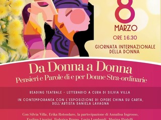 Vallecrosia celebra la Giornata internazionale della donna con un reading teatrale-letterario a cura di Silvia Villa, arricchito dall’esposizione delle opere a china su carta dell’artista Daniela Lavagna. Ieri, alla biblioteca civica, è, infatti, andato in scena "Da donna a donna. Pensieri e parole di e per donne stra-ordinarie".