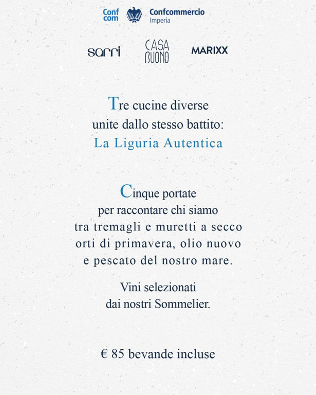 Nei mesi di marzo e aprile il Ristorante Marixx di Cala del Forte (Ventimiglia), guidato dallo chef Riccardo Marcenaro, il Ristorante Sarri di Borgo Prino (Imperia), con lo chef Andrea Sarri, e il Ristorante Casa Buono di Trucco (Ventimiglia), dello chef Antonio Buono, tutti associati Confcommercio, proporranno tre diverse interpretazioni della cucina ligure unite da un unico battito: quello della Liguria autentica.