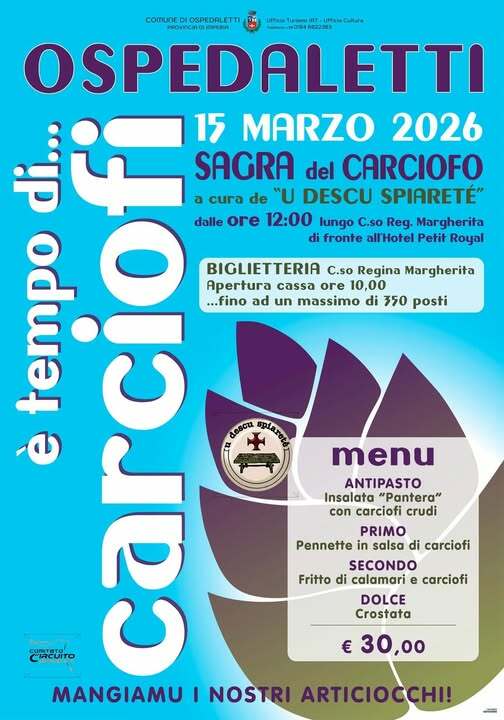 Domenica 15 marzo è il giorno stabilito per lo svolgimento della “Sagra del Carciofo” uno degli appuntamenti ormai classici nel Calendario degli eventi a Ospedaletti. Da poco tempo, vista la crescente partecipazione del pubblico, la location della Sagra è stata spostata lungo il 'Boulevard', cioè l'ampio tratto di marciapiede di Corso Regina Margherita tra il bar Alexandra e l'hotel Petit Royal. A disposizione ci sono 350 posti a sedere e i biglietti si potranno acquistare a partire dalle h.10 della stessa mattinata di domenica. L'organizzazione della “Sagra del Carciofo” è come sempre a cura dell'associazione locale di volontari 'U Descu Spiaretè'.