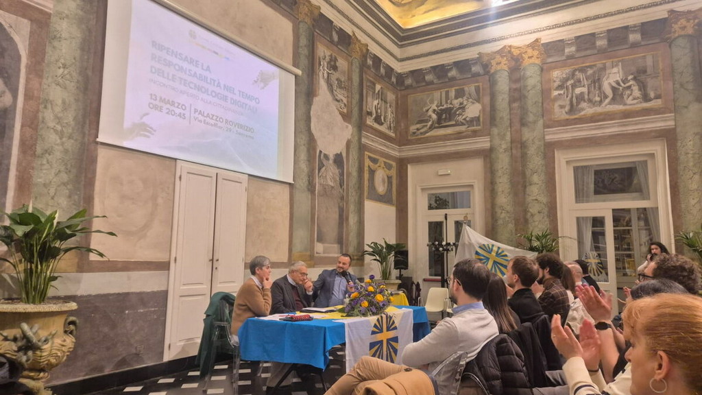 Nella suggestiva cornice di Palazzo Roverizio, a Sanremo, si è svolto venerdì sera l’incontro dal titolo “Ripensare la responsabilità nel tempo delle tecnologie digitali”, organizzato dall’Azione Cattolica diocesana, settore adulti. L’appuntamento ha registrato una partecipazione numerosa e variegata: accanto agli aderenti all’associazione, erano presenti anche molti cittadini esterni, attratti dai relatori, contribuendo così a rendere particolarmente ricco e stimolante il dibattito finale, caratterizzato da interventi provenienti da prospettive differenti.