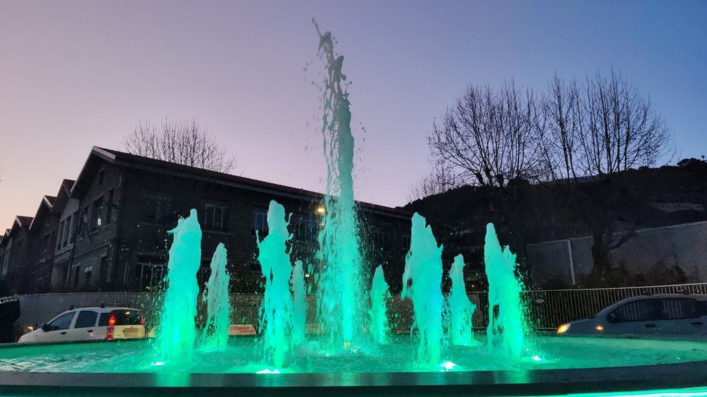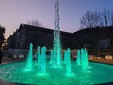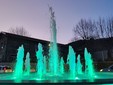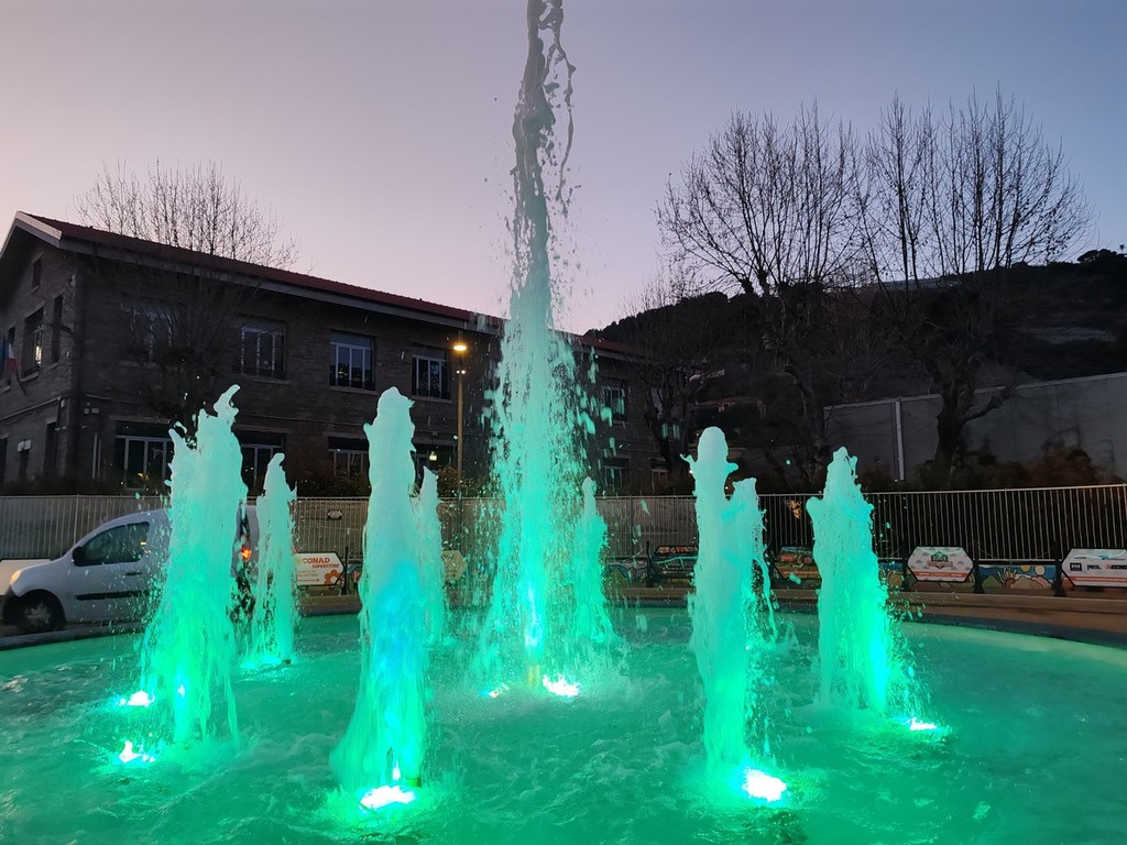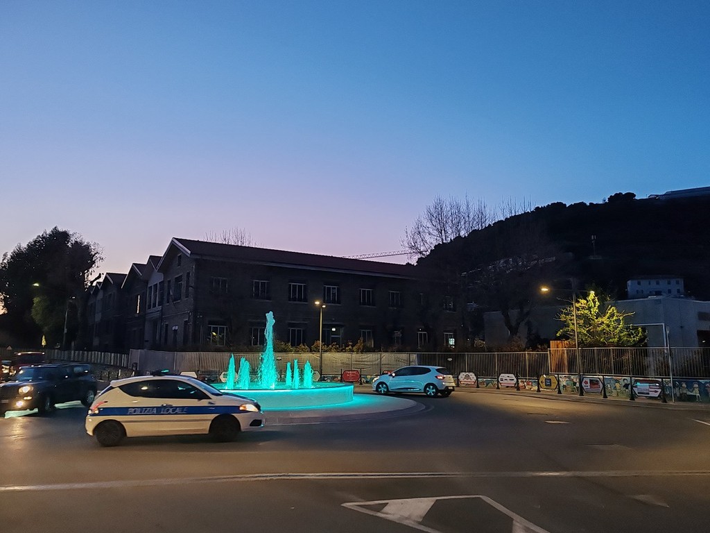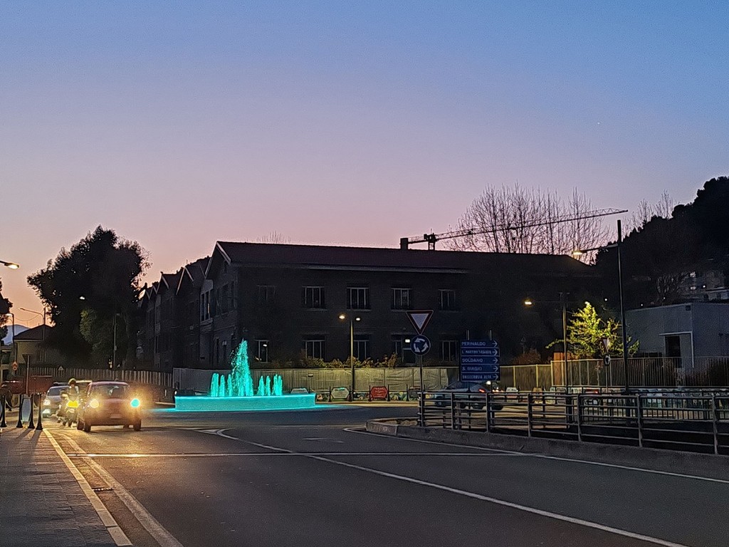 Zampilli d'acqua colorati. Vallecrosia ha ufficialmente inaugurato questa sera, al tramonto, la nuova fontana alla rotonda situata vicino alle scuole.