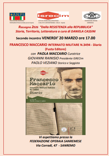 Il secondo appuntamento è in programma venerdì 20 marzo alle ore 17, presso la sede della Federazione Operaia Sanremese in via Corradi 47, con ingresso libero. Al centro dell’incontro la presentazione della recente pubblicazione dell’ISRECIm, “Francesco Maccario internato militare italiano n. 3494 – Diario”, edita da Fusta Editore.