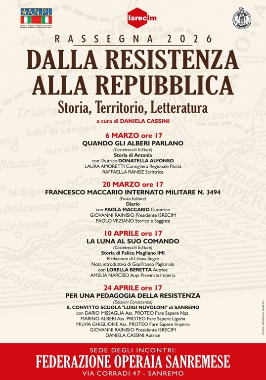 Prosegue la rassegna culturale 2026 “Dalla Resistenza alla Repubblica. Storia, territorio, letteratura”, promossa dall’Istituto Storico della Resistenza di Imperia, dall’ANPI Provinciale Imperia e dalla Federazione Operaia Sanremese, con la cura di Daniela Cassini.