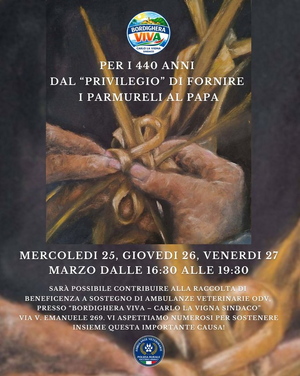 Tradizione, parmureli e solidarietà per gli animali. Nei pomeriggi di mercoledì 25, giovedì 26 e venerdì 27 marzo, dalle 16:30 alle 19:30, in via Vittorio Emanuele 269, a Bordighera si terrà una raccolta fondi, in occasione del 440° anniversario del privilegio della città delle palme di fornire i parmureli al Vaticano, a favore dell’associazione Ambulanze Veterinarie Odv.