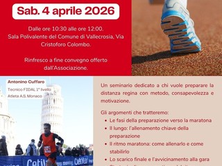 L'evento è stato organizzato dall'Atletica Vallecrosia con il patrocinio del comune di Vallecrosia al Mare. "E' stato il secondo seminario di 'Oltre il traguardo'. E' stato un piacevole successo, siamo contenti e soddisfatti. Ringraziamo il relatore, che ha dedicato un po' del suo prezioso tempo a quest'incontro, e i partecipanti" - dicono gli organizzatori - "Ringraziamo, inoltre, il comune di Vallecrosia al Mare per il patrocinio e l'ospitalità e l'associazione Le Cinque Torri che ci assiste nella preparazione della sala. Il prossimo appuntamento sarà il 4 aprile dalle 10.30 alle 12 in sala polivalente del Comune, su 'Il percorso verso la maratona'. Si parlerà del percorso di preparazione per portare al termine una maratona e per migliorare la propria performance. L'ingresso è gratuito e aperto a tutti ma è gradita la prenotazione. Sarà comunque possibile lasciare una piccola offerta a sostegno dell'attività dell'associazione".