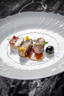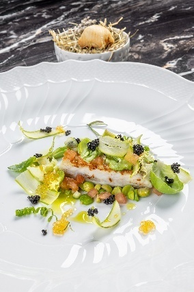 L'agnello è locale, sambucano, dalla carne compatta e delicata. Viene servito in due cotture. Il lingottino di spalla e coscia e la Chateaubriand. Ad accompagnare una melenzana alla parmigiana ricreata nella forma di oliva con miso di pomodoro, e tartare di melanzana con aria di latticello. Rombo. Piselli, fave, asparagi e curry verde. Un piatto che porta in tavola la primavera, alla vista nei suoi colori vivaci e al palato. Una ventata di mare tra le colline, con il sapore delicato del Rombo che si incontra con il vegetale in una piacevole leggerezza. Il tutto accompagnato da un bite di pizza di scarola che rimanda la mente alle domeniche pasquali.