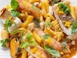 Tra i piatti: Zuppa di Mare. Pasta mista, primizie e agrumi. L'ispirazione è la Mesca Francesca, qui fatta con il mare. Risottata con un brodetto dell'Adriatico, che sprigiona una sapidità intensa e a completare trancetti di pescato succulenti e limone di Amalfi. L'Agnello. Melanzana, Provola e pomodoro.