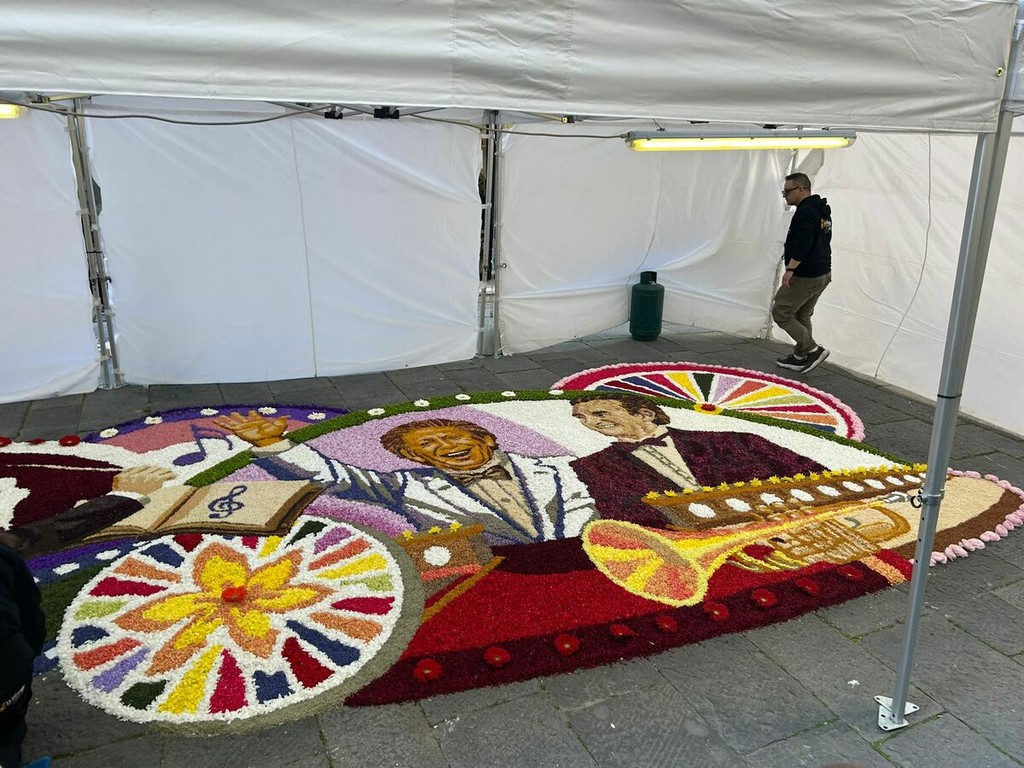 “È un’opera collegata al tema del Corso Fiorito di Sanremo – spiega Giuliano Torti, presidente degli infioratori di Spello –. Abbiamo rappresentato la storia della musica e della televisione e, nella parte finale, ci sono le icone come Vessicchio, Baudo e Mike Bongiorno”.