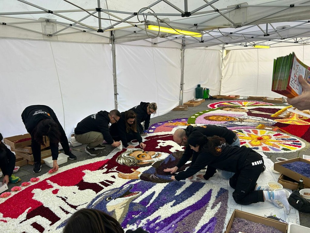 È stata inaugurata nel pomeriggio, in piazza Nota, l’infiorata realizzata dagli artisti di Spello, uno degli appuntamenti più attesi del Festival dei Fiori 2026. Un’opera che ha preso forma fin dalle prime luci dell’alba, quando – alle 4 del mattino – i 40 infioratori umbri hanno iniziato a lavorare senza sosta, trasformando la piazza in un grande quadro floreale.
