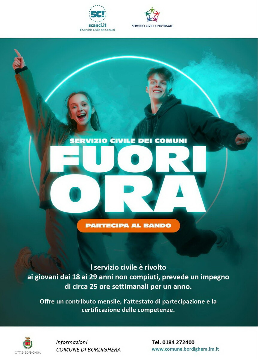 Il Comune di Bordighera ricorda che è stato pubblicato il bando di selezione per il Servizio Civile Universale, con scadenza l’8 aprile 2026 alle ore 14. Saranno selezionati 2 giovani che saranno inseriti nei servizi comunali della Biblioteca Civica, con un impegno di 25 ore settimanali.