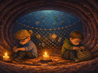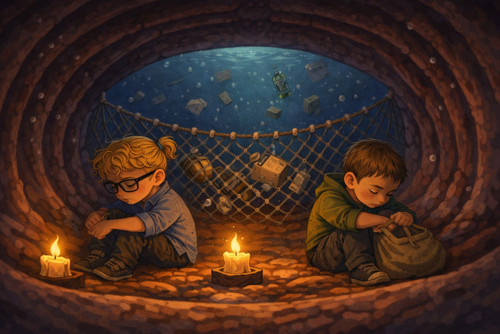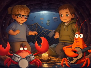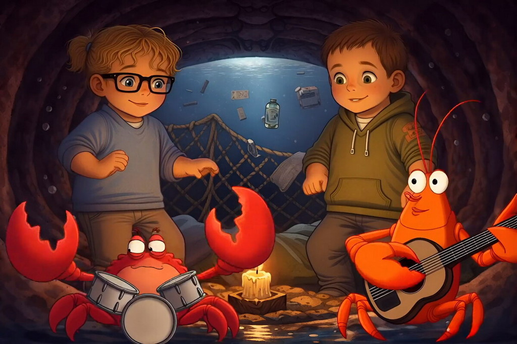 Nel loro percorso incontrano icone e simboli che emergono dal buio: dal relitto del Titanic al sottomarino giallo, fino a figure mitiche e pop che popolano questo universo onirico. Tra queste, spicca una presenza ironica e rassicurante: una figura marinara che richiama “Sailing”, spirito guida capace di portare luce anche nei momenti più oscuri. La narrazione evolve verso una trasformazione: il fondale diventa spazio creativo, abitato da sirene e creature marine che si fanno musicisti. In questo scenario, i due protagonisti ritrovano la forza di suonare. La musica diventa salvezza, ponte tra ciò che ferisce e ciò che cura.
