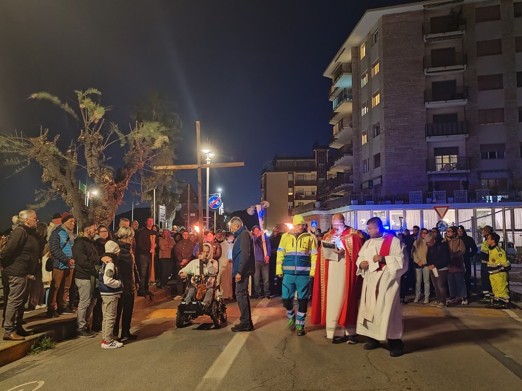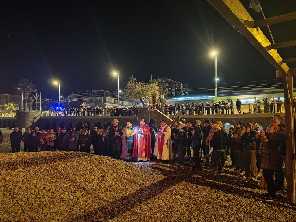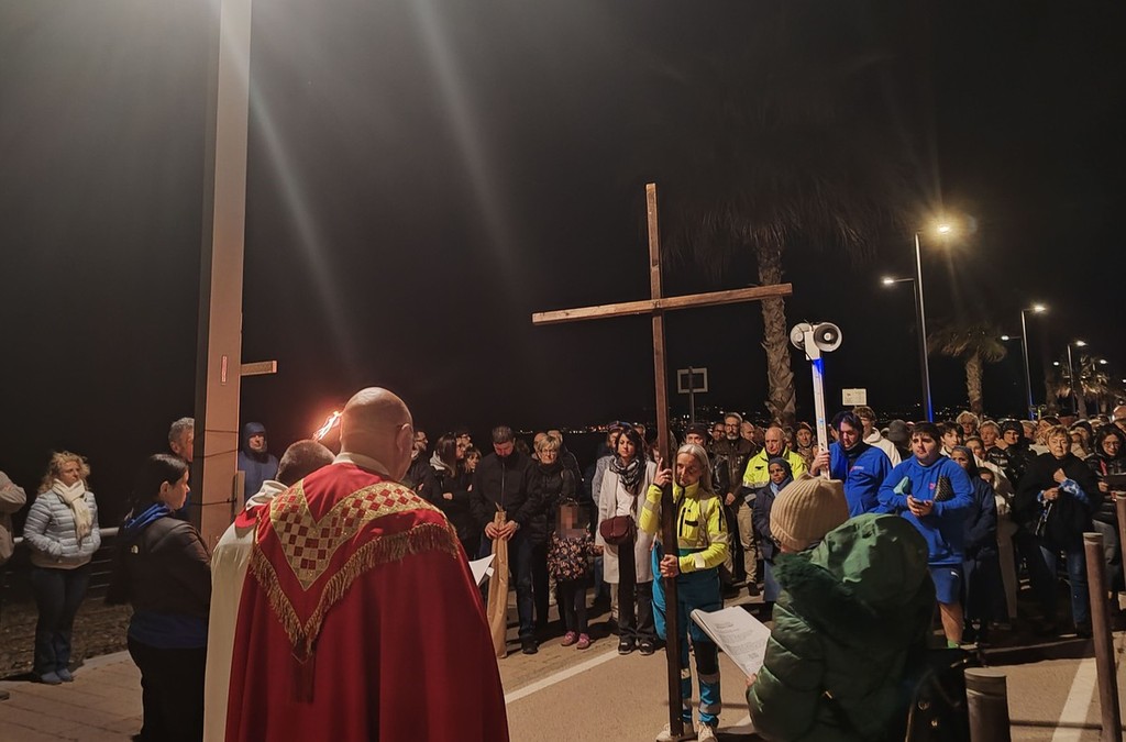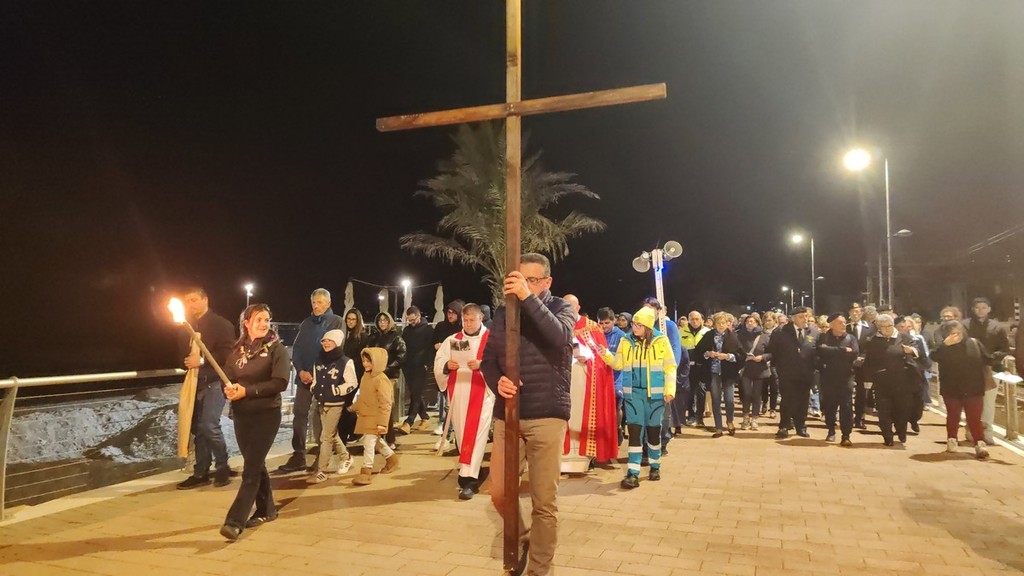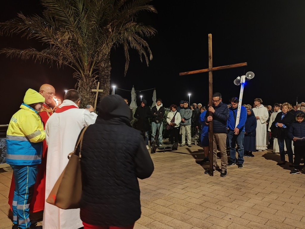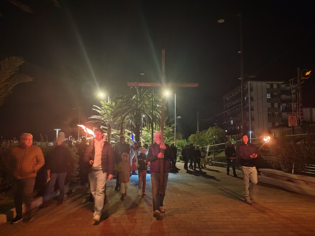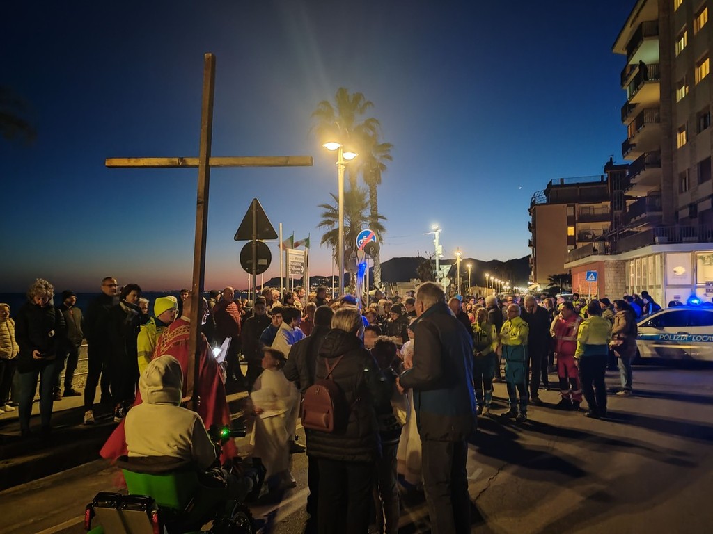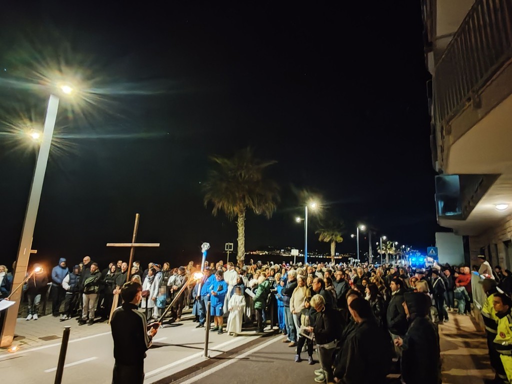 Via Crucis cittadina sul lungomare. Nella serata del Venerdì Santo, la comunità di Vallecrosia al Mare si è riunita per ricostruire e commemorare il percorso doloroso di Gesù Cristo verso la crocifissione.