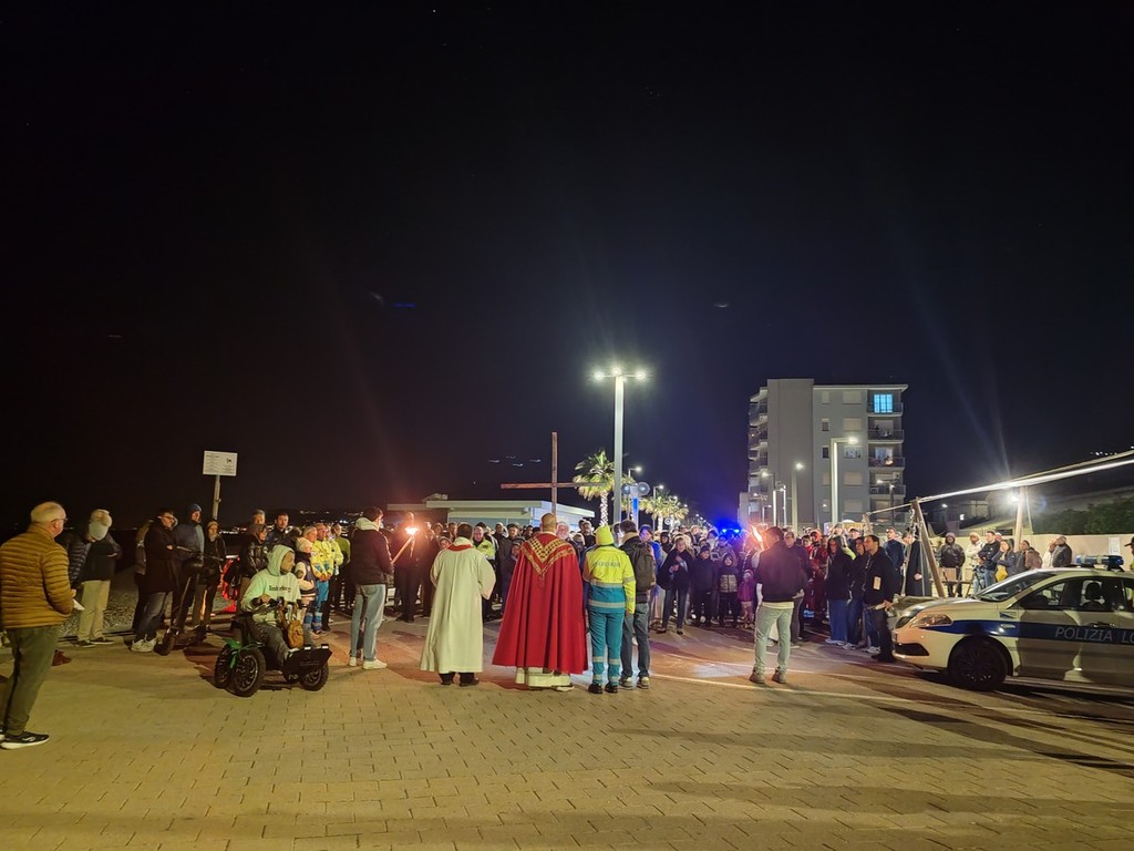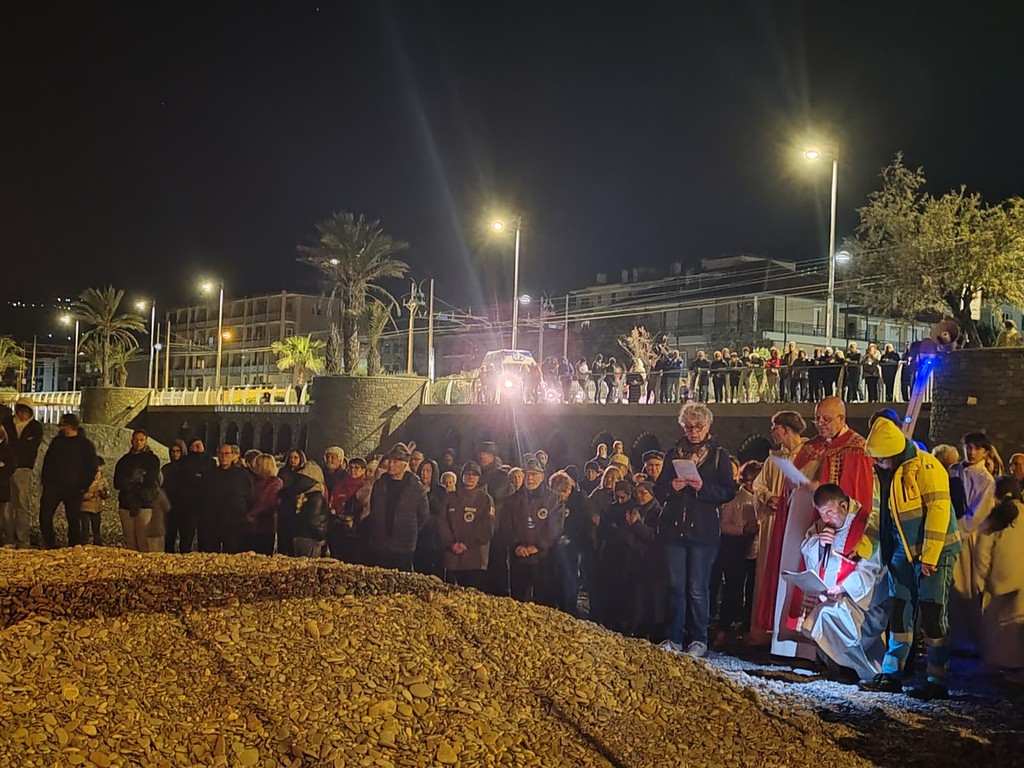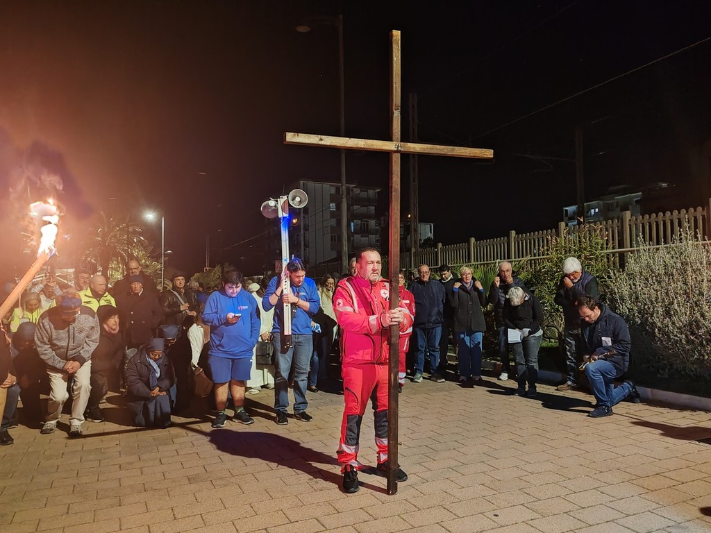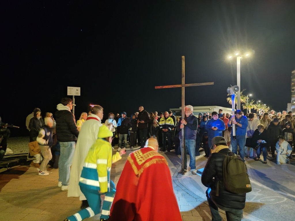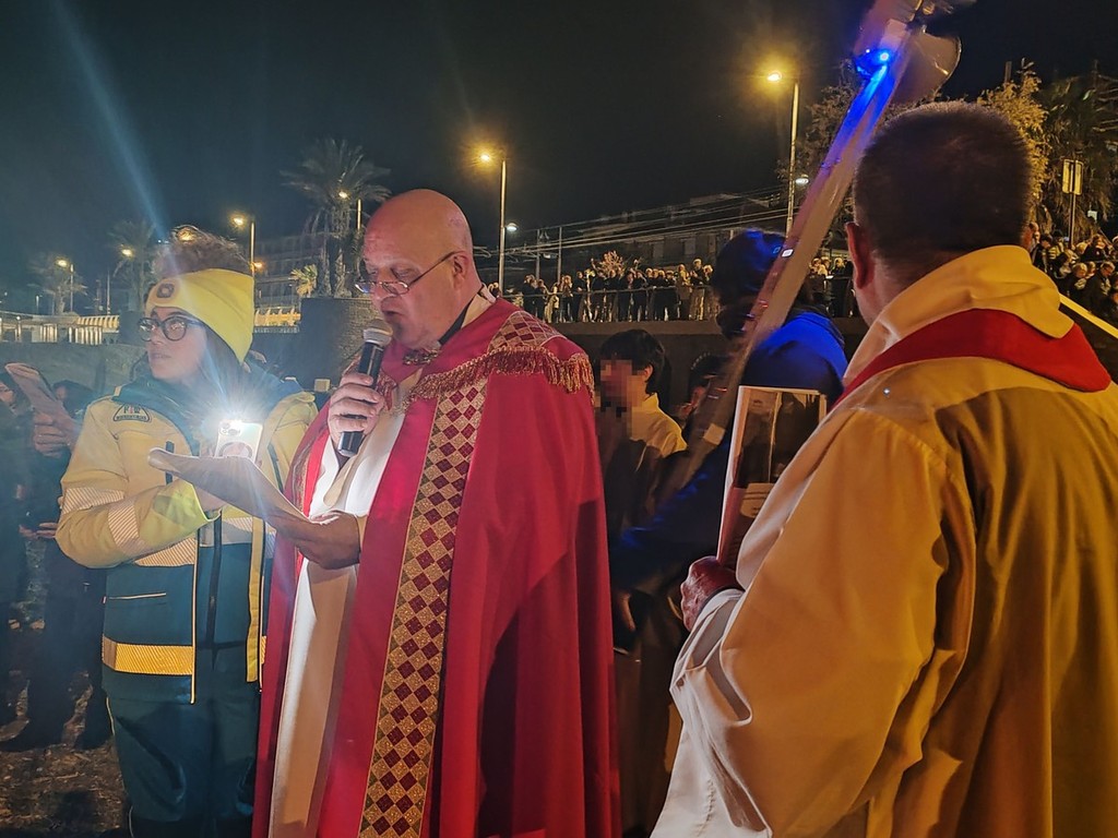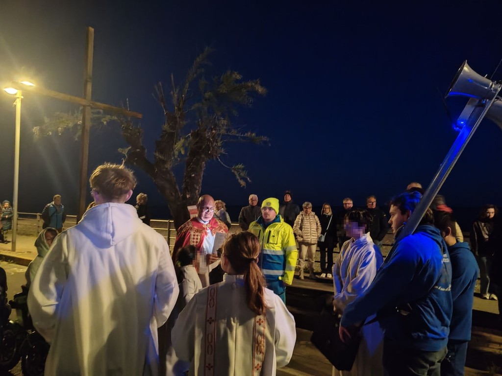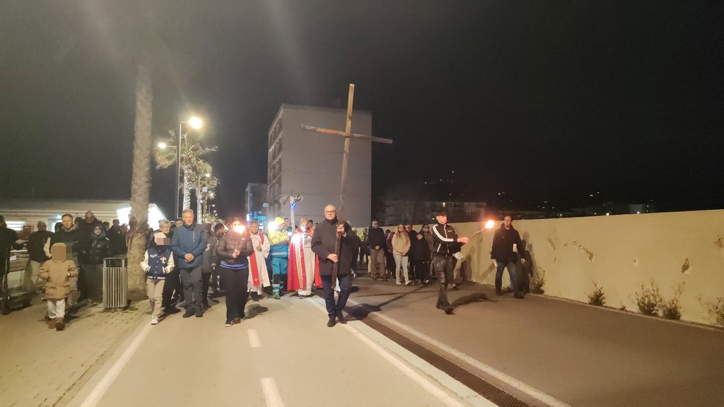 Via Crucis cittadina sul lungomare. Nella serata del Venerdì Santo, la comunità di Vallecrosia al Mare si è riunita per ricostruire e commemorare il percorso doloroso di Gesù Cristo verso la crocifissione.