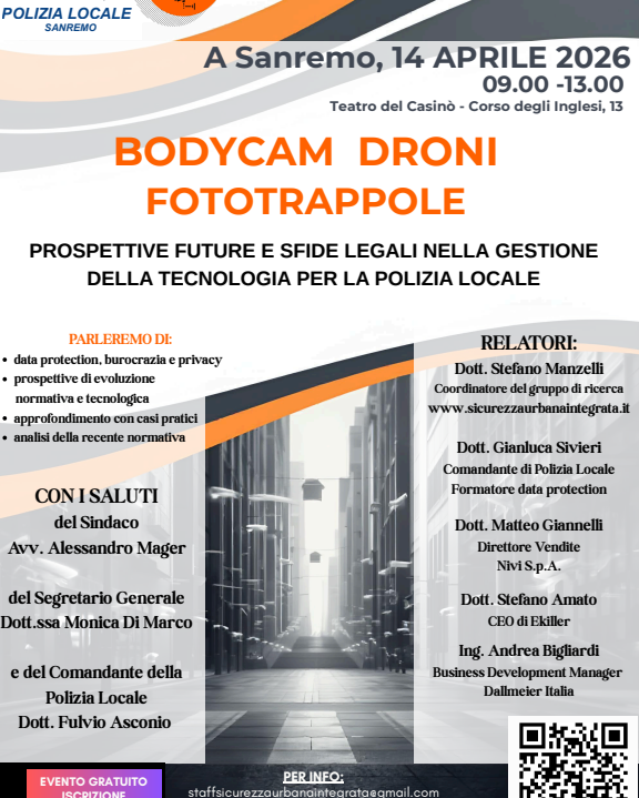 L’evento sarà introdotto dai saluti istituzionali di Alessandro Mager (sindaco del Comune di Sanremo), Monica Di Marco (segretario generale del Comune di Sanremo), Fulvio Asconio (comandante del corpo di Polizia locale di Sanremo), Santo Fabiano (DPO del Comune di Sanremo).