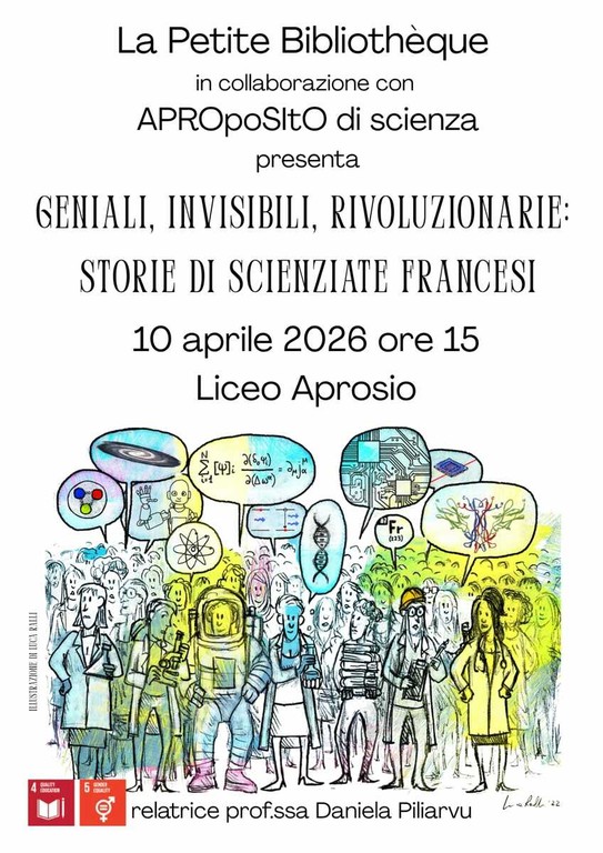 Il ciclo di incontri, inaugurato nel mese di febbraio, prosegue venerdì alle ore 15.00 con un interessante intervento a cura della professoressa Daniela Piliarvu che, in collaborazione con “Aproposito di scienza”, presenterà una conferenza dal titolo: “Geniali, invisibili, rivoluzionarie: storie di scienziate francesi”.