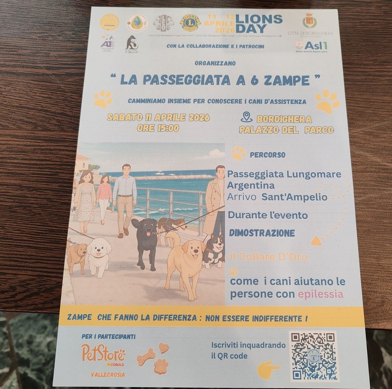 Sabato alle 15 verrà organizzata una passeggiata a 6 zampe, che partirà dal Palazzo del Parco a Bordighera mentre alle 20 è prevista la cena 'Light my Lions'. "Un’iniziativa aperta a tutti dedicata alla scoperta del ruolo fondamentale dei cani d’assistenza. L’evento, organizzato con la collaborazione di diverse realtà associative e istituzionali, si terrà sabato 11 aprile alle 15 con partenza da Palazzo del Parco. Il percorso si snoderà lungo il suggestivo Lungomare Argentina con arrivo previsto nella zona dell’Hotel Parigi" - mette in risalto Raffaella Fogliarini, presidente del Comitato Lions Day - "Obiettivo dell’iniziativa è quello di promuovere consapevolezza e inclusione, invitando cittadini e famiglie a partecipare a una camminata condivisa insieme ai propri amici a quattro zampe. Camminiamo insieme per conoscere i cani d’assistenza, veri e propri supporti indispensabili per molte persone. Durante il pomeriggio è prevista anche una dimostrazione speciale intitolata 'Il Collare d’Oro', dedicata a mostrare concretamente come i cani aiutano le persone con epilessia, offrendo un importante momento di informazione e sensibilizzazione su una tematica spesso poco conosciuta. Un’occasione per approfondire il valore del legame tra uomo e animale, all’insegna della solidarietà".