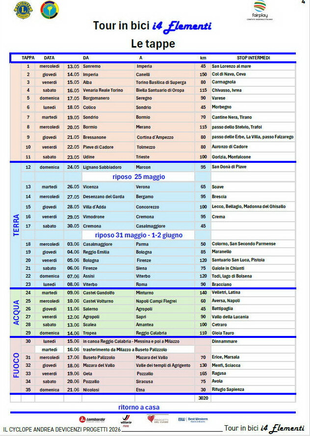Partirà il 13 maggio da Sanremo il nuovo progetto dell’atleta paralimpico Andrea Devicenzi, protagonista del “Tour in bici alla scoperta dei 4 elementi”, un viaggio di oltre 3.000 chilometri lungo l’Italia che si concluderà il 21 giugno sull’Etna. L’iniziativa, presentata lo scorso 24 marzo al Senato di Roma, si svilupperà in 35 tappe distribuite in 40 giorni, attraversando il Paese in un percorso che prevede un dislivello complessivo pari a quasi quattro volte l’altezza dell’Everest.