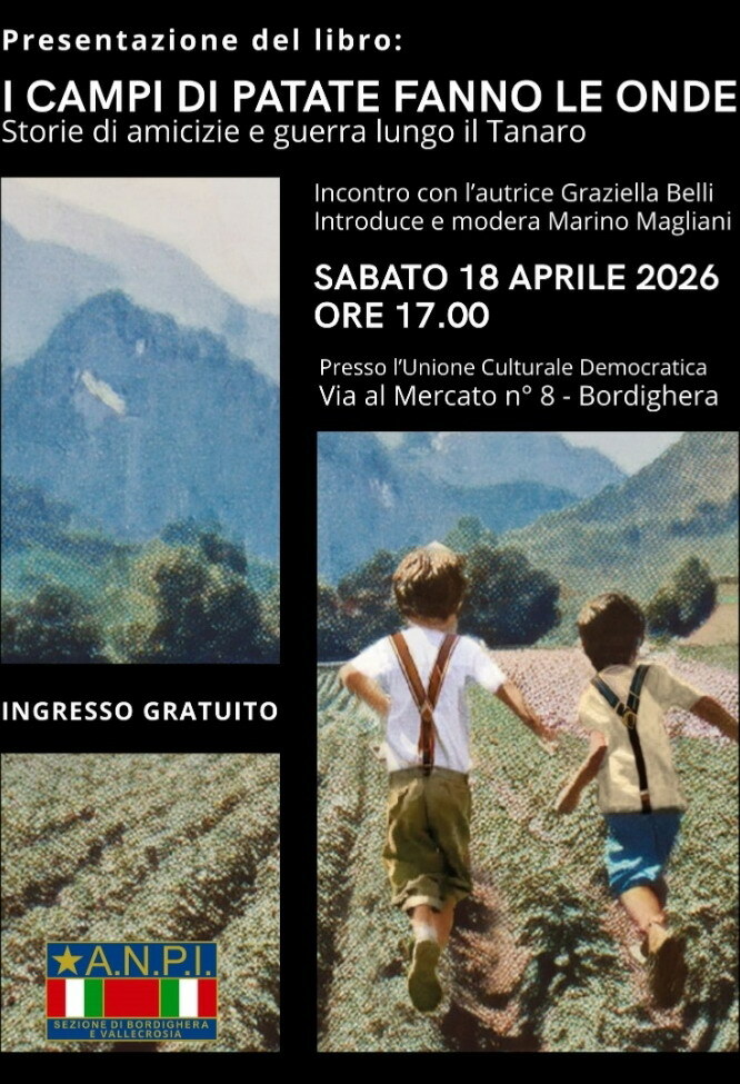Sabato 18 aprile, alle ore 17, presso l'Unione Culturale Democratica a Bordighera (via al mercato 8), sarà presentato il libro 'I campi di patate fanno le onde' della scrittrice Graziella Belli, modera Marino Magliani.