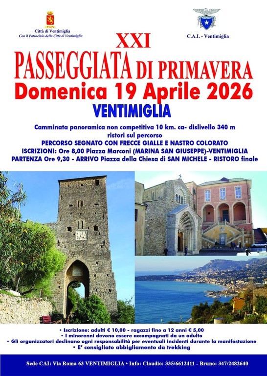 Il Cai di Ventimiglia proporrà iniziative ed eventi. Il primo sarà la "Passeggiata di Primavera" che verrà proposta domenica 19 aprile "Si tratta di una camminata panoramica non competitiva di dieci chilometri con un dislivello di 340 metri" - dicono gli organizzatori - "Il percorso sarà segnato con frecce gialle e nastro colorato e vi saranno dei punti di ristoro lungo il percorso e all'arrivo. Saranno , inoltre, presenti un servizio di assistenza con ambulanze e nucleo alpino di Ventimiglia. Ci si potrà iscrivere alle 8 in pizza Marconi a Marina San Giuseppe. La partenza sarà alle 9.30. I minorenni devono essere accompagnati da un adulto. Si consiglia un abbigliamento da trekking".