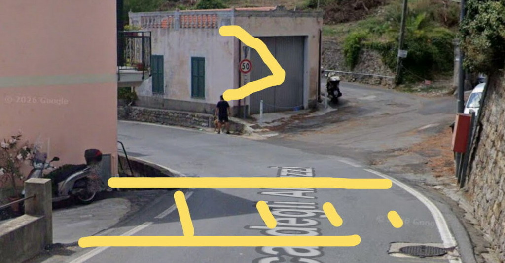 - Punto cieco totale: l’attraversamento si troverebbe subito dopo una curva a gomito, con edifici e muretti che impedirebbero la visibilità dei pedoni fino all’ultimo istante.