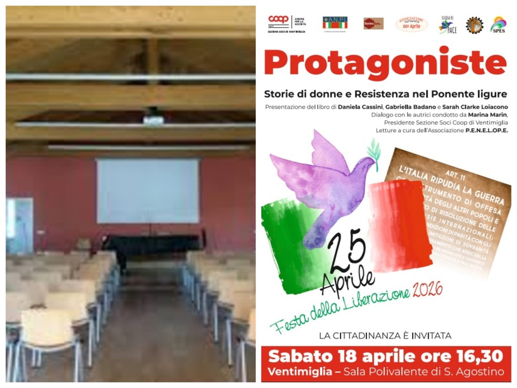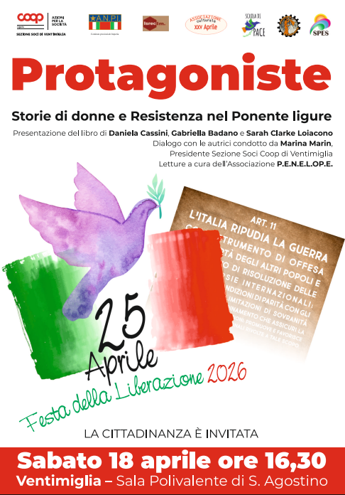 “Protagoniste - Storie di donne e Resistenza nel Ponente ligure” verrà presentato sabato 18 aprile alle 16.30 nella sala polivalente di Sant'Agostino a Ventimiglia. In occasione dell’anniversario della Liberazione, la sezione soci Coop Liguria di Ventimiglia organizza un incontro pubblico per la presentazione del libro a cura delle autrici Daniela Cassini, Gabriella Badano e Sarah Clarke Loiacono.