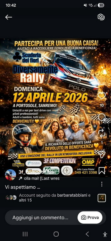 L’idea fu — e resta — di Luca Fidale, presidente della Scuderia dei Fiori e titolare di 3F Competition, che allora portò nel Nord Italia la prima iniziativa di questo tipo, poi replicata altrove. L’obiettivo non è mai cambiato: offrire una giornata speciale alle associazioni del territorio, coinvolgendo giovani che, sapendo dell’evento, arrivano entusiasti. Il loro sorriso è la vera benzina di questa manifestazione. Quest’anno si è ricomposto anche il gruppo storico: Luca Fidale, Luca Oggiero, Franco Revelli, Alessandro Deveronico, insieme agli ufficiali di gara della XRallyTeamSanremo. A dare voce e ritmo alla giornata, lo speaker Agostino Orsino, la new entry Alessia Pavone e il DJ Ace. Un ringraziamento condiviso va agli sponsor che hanno sostenuto l’edizione: Costa Ligure, Bardahl, OMP, FGN Climatizzazione, 4 Mori Prodotti Tipici Sardi, Igea Soluzioni Ortopediche.