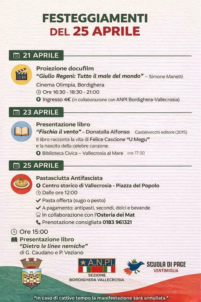 Il momento centrale delle celebrazioni sarà naturalmente venerdì 25 aprile, con una giornata pensata per unire memoria storica e socialità. A partire dalle 12 il centro storico di Vallecrosia, in piazza del Popolo, ospiterà la tradizionale Pastasciutta Antifascista. Sarà offerta pasta al sugo o al pesto, mentre antipasti, secondi, dolci e bevande saranno disponibili a pagamento. L’iniziativa si svolgerà in collaborazione con l’Osteria dei Mat ed è consigliata la prenotazione.