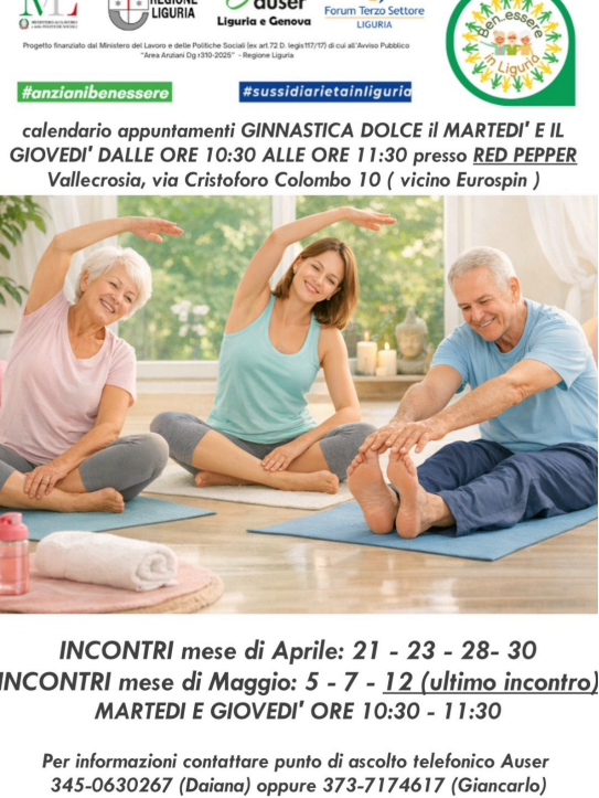 Prende il via da oggi il secondo ciclo di incontri di ginnastica dolce gratuiti organizzati da Auser APS Ventimiglia, nell’ambito delle iniziative del Patto Anziani promosse con Regione Liguria.