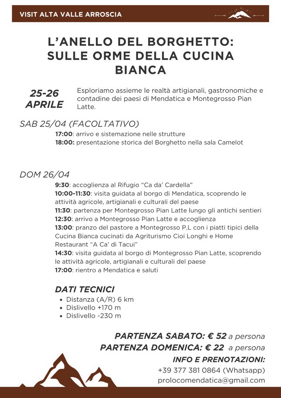 9.30. ‘Anello del Borghetto’: visita guidata al borgo di Mendatica, alla scoperta delle attività agricole, artigianali e culturali del paese + Pranzo del Pastore a base dei piatti tipici della Cucina Bianca a Montegrosso Pian Latte + visita al borgo di Montegrosso Pian Latte ed la scoperta delle sue attività agricole, artigianali e culturali + saluti finali a Mendatica. Info e prenotazioni whatsapp +39 377 381 08 64 (i dettagli nella locandina)