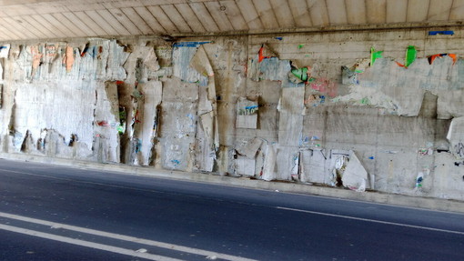 Le pareti della galleria sono ricoperte da strati sovrapposti di manifesti pubblicitari, logori e scollati, che l’umidità ha trasformato in fogli pesanti e instabili. “Si staccano a brandelli – scrive il lettore – e rischiano di finire sulla carreggiata, soprattutto quando passano moto o scooter. È un pericolo reale”.
