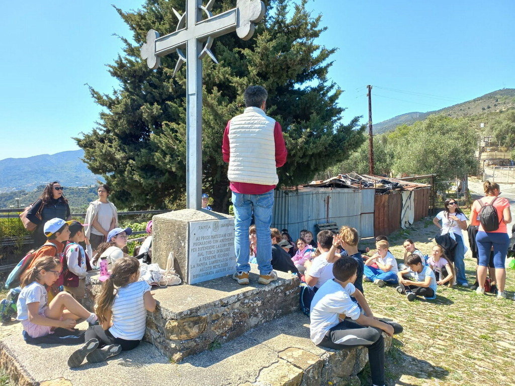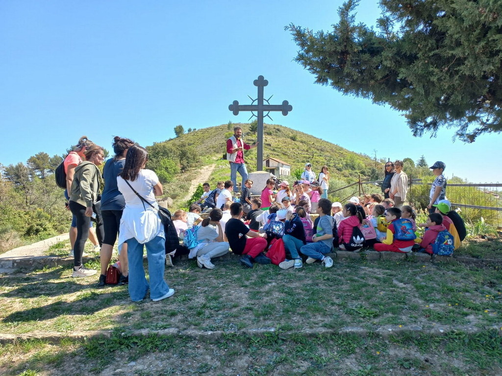 Il percorso ha permesso di tracciare un quadro storico complessivo del territorio, risalendo fino alle epoche più remote. Si è parlato dell’importanza dell’antico Castellaro ligure, con riferimenti alle postazioni strategiche del Monte Colma, del Bignone e del Caggio, vette che un tempo ospitavano gli insediamenti fortificati delle popolazioni locali. Per toccare con mano la vita di un tempo, i bambini hanno visitato i vicini lavatoi presso la Croce della Parà, un simbolo della quotidianità e della fatica di chi abitava queste colline prima dell’arrivo della modernità. Non è mancato il momento del racconto epico: la storica battaglia della Croce della Parà, avvenuta il 7 agosto 1543. Gli alunni hanno ascoltato con il fiato sospeso le vicende della resistenza locale contro le incursioni dei pirati Barbareschi, comprendendo il valore del coraggio dei propri antenati nella difesa della propria terra.