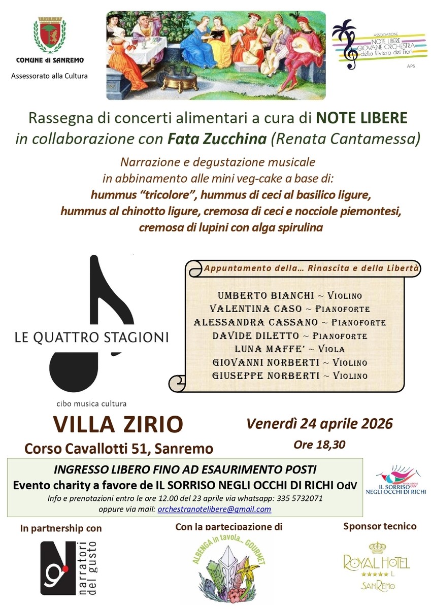 Sanremo rinnova il suo impegno verso una cultura viva, inclusiva e contemporanea con il ritorno dei Concerti Alimentari, il format che unisce l’Associazione Note Libere con la Fata Zucchina (Renata Cantamessa), giunto al suo terzo anno e inserito nel ciclo narrativo de “Le Quattro Stagioni”.