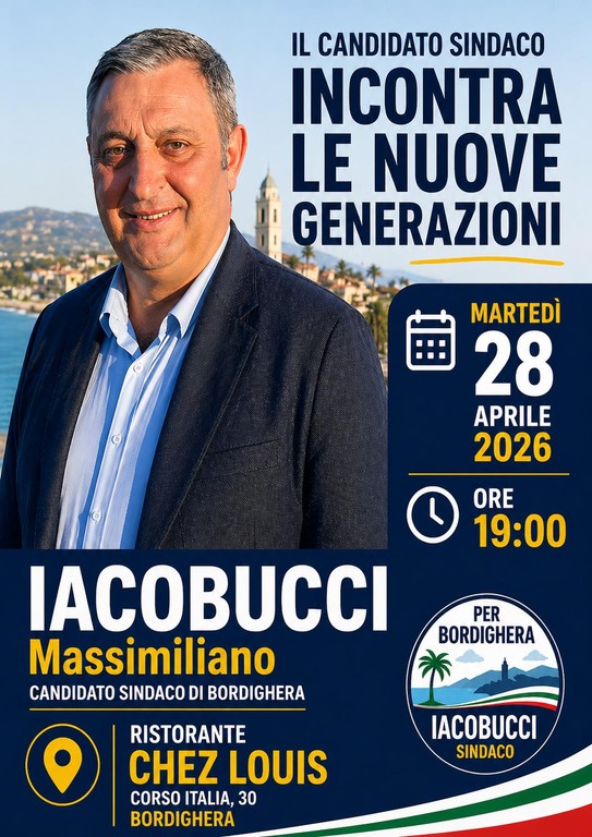 Il candidato sindaco a Bordighera Massimiliano Iacobucci incontra le nuove generazioni. L'appuntamento sarà il 28 aprile alle 19 al ristorante Chez Louis, in corso Italia.